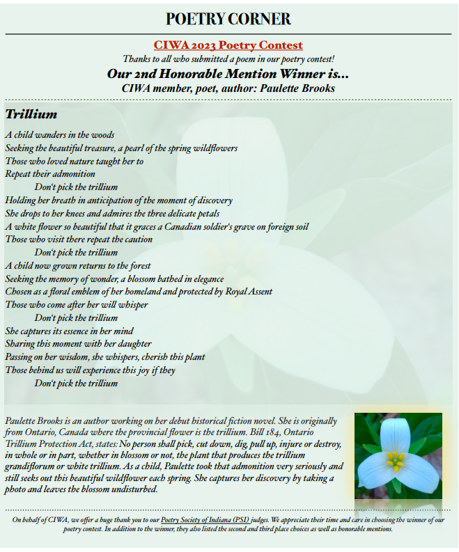 CIWA 2023 Poetry Contest Honorable Mention Winner-Paulette Brooks! Congratulations to our CIWA 2023 Poetry Contest Honorable Mention Winner-Paulette Brooks!